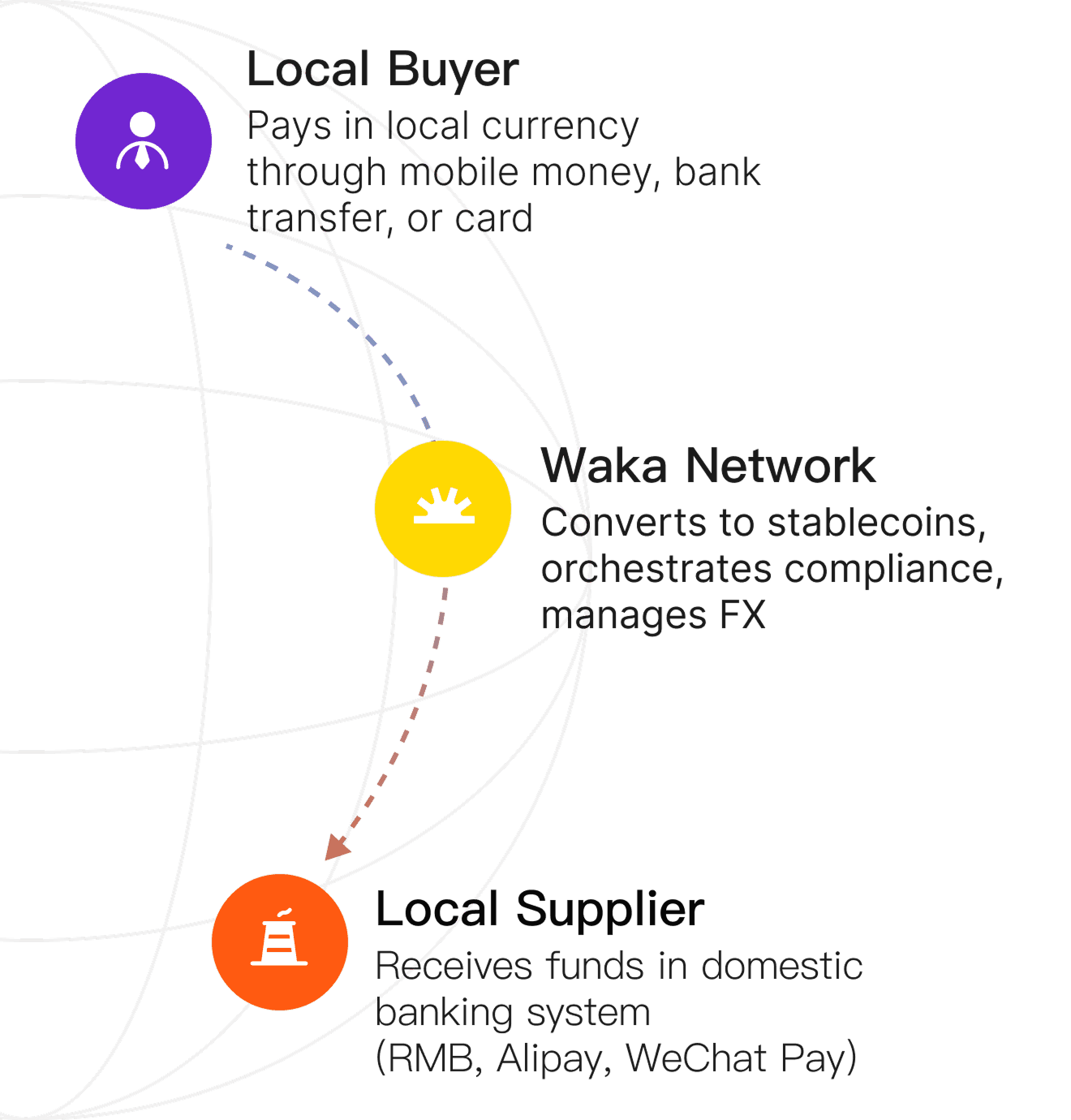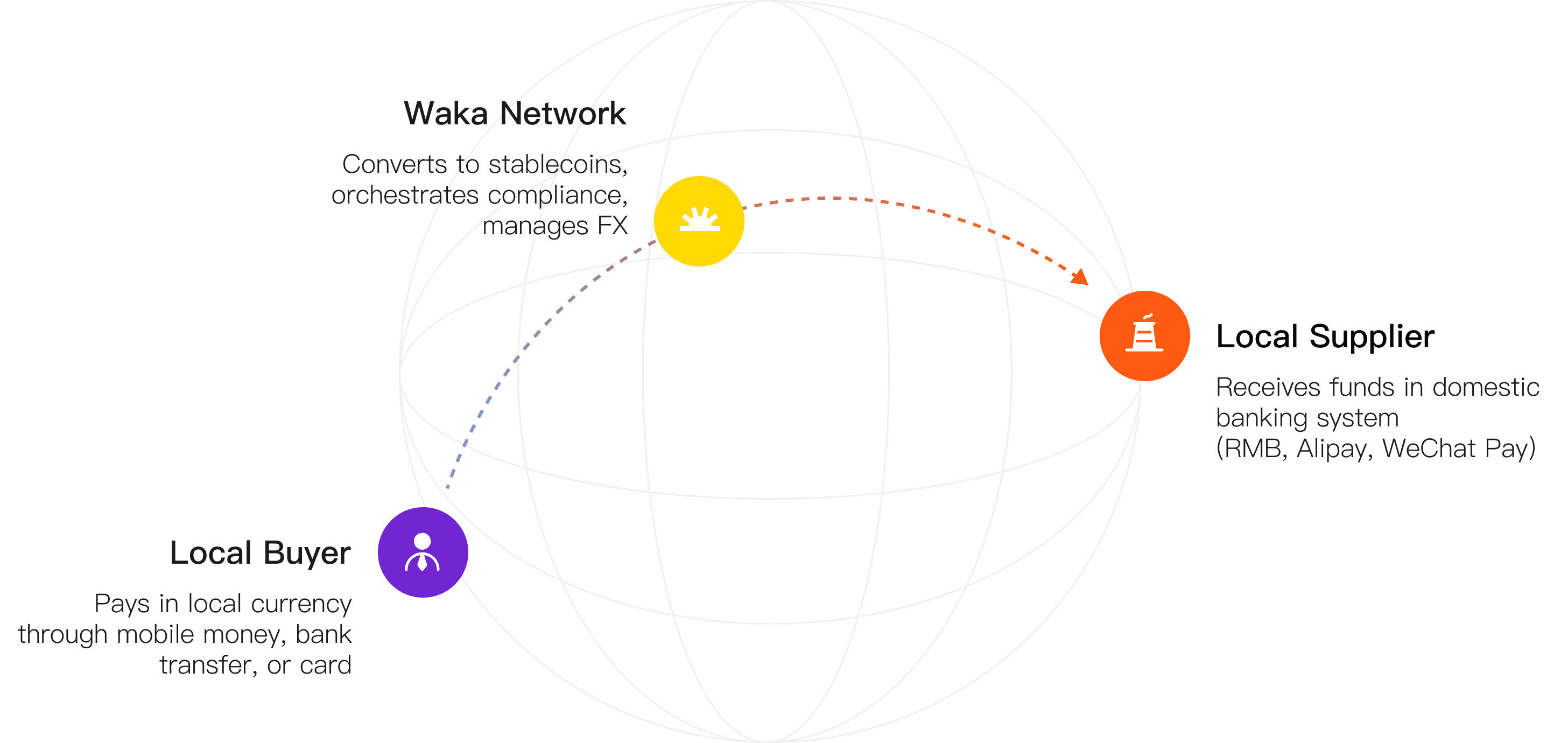 Waka is the first network that combines local collections in African and other emerging markets, stablecoin transport and FX, and direct RMB settlement to suppliers in China. This removes the most painful step in many emerging market supply chains: multi-currency hops through USD or EUR, extended settlement times, and opaque FX.